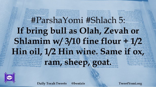 #ParshaYomi #Shlach 5: If bring bull as Olah, Zevah or Shlamim w/ 3/10 fine flour + 1/2 Hin oil, 1/2 Hin wine. Same if ox, ram, sheep, goat.