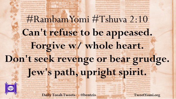#RambamYomi #Tshuva 2:10 Can’t refuse to be appeased. Forgive w/ whole heart. Don’t seek revenge or bear grudge. Jew’s path, upright spirit.