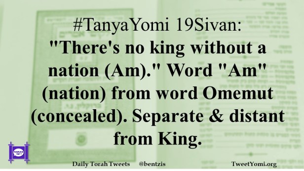 TanyaYomi 19Sivan: “There’s no king without a nation (Am).” Word “Am” (nation) from word Omemut (concealed). Separate & distant from King.