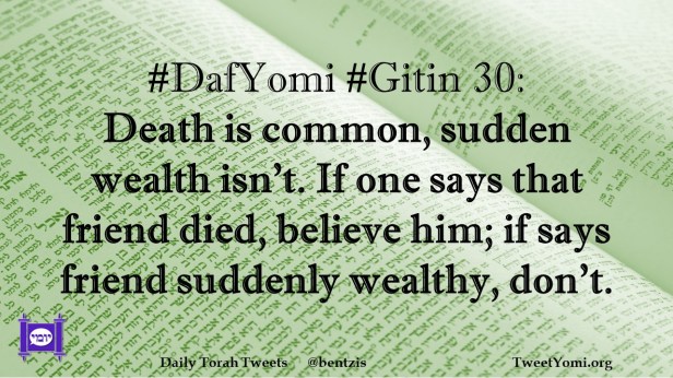 DafYomi, Gitin #DafYomi #Gitin 30 Date: June 16, 2023Author: netanelspitz #DafYomi #Gitin 30: Death is common, sudden wealth isn’t. If one says that friend died, believe him; if says friend suddenly wealthy, don’t. Share this: Share on X (Opens in new window) X Share on Facebook (Opens in new window) Facebook Like Loading... Related