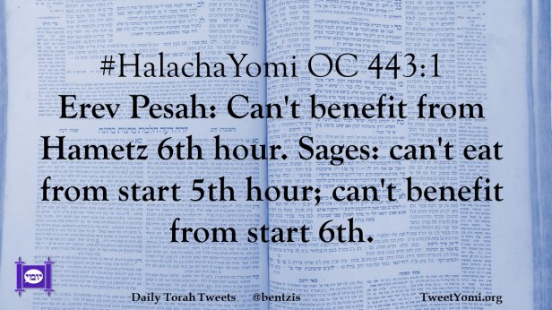 #HalachaYomi OC 443:1 Erev Pesah: Can’t benefit from Hametz 6th hour. Sages: can’t eat from start 5th hour; can’t benefit from start 6th.