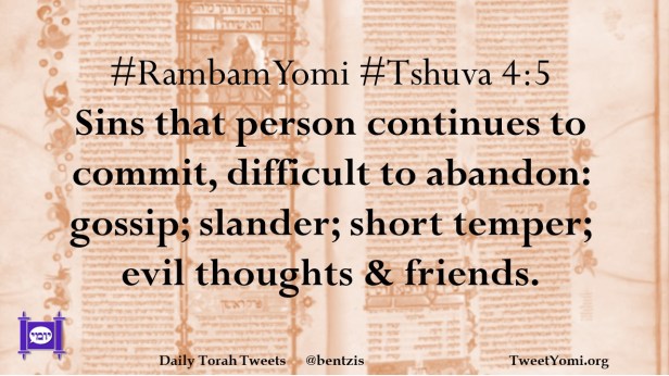 #RambamYomi #Tshuva 4:5 Sins that person continues to commit, difficult to abandon: gossip; slander; short temper; evil thoughts & friends.