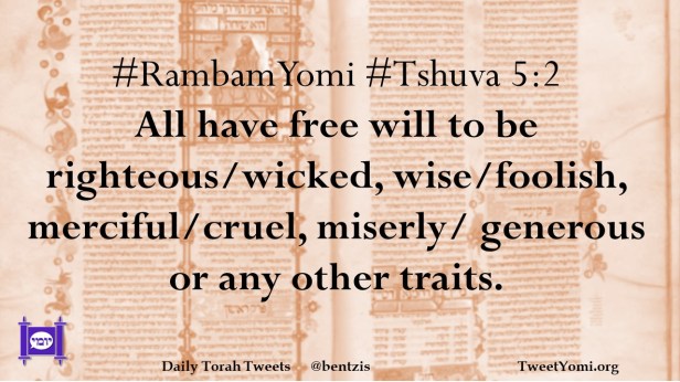 #RambamYomi #Tshuva 5:2 All have free will to be righteous/wicked, wise/foolish, merciful/cruel, miserly/ generous or any other traits.