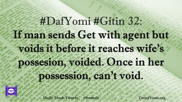 DafYomi, Gitin #DafYomi #Gitin 32 Date: June 28, 2023Author: netanelspitz #DafYomi #Gitin 32: If man sends Get with agent but voids it before it reaches wife’s possesion, voided. Once in her possesion, can’t void. Share this: Share on X (Opens in new window) X Share on Facebook (Opens in new window) Facebook Like Loading... Related