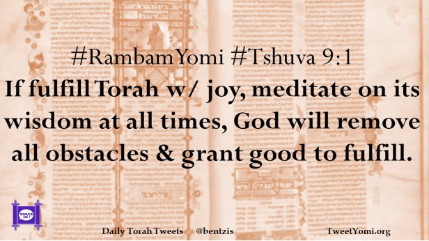 #RambamYomi #Tshuva 9:1 If fulfill Torah w/ joy, meditate on its wisdom at all times, God will remove all obstacles & grant good to fulfill.