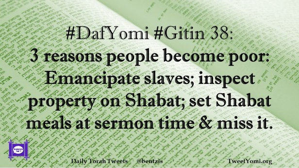 DafYomi, Gitin #DafYomi #Gitin 38 Date: June 29, 2023Author: netanelspitz #DafYomi #Gitin 38: 3 reasons people become poor: Emancipate slaves; inspect property on Shabat; set Shabat meals at sermon time & miss it. Share this: Share on X (Opens in new window) X Share on Facebook (Opens in new window) Facebook Like Loading... Related