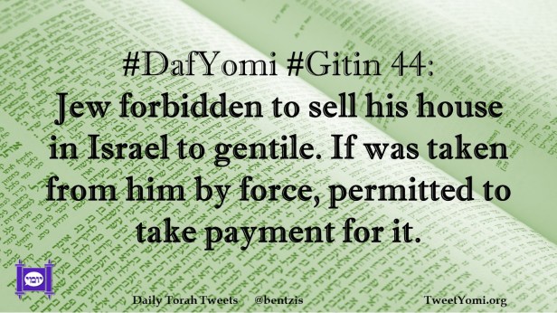 DafYomi, Gitin #DafYomi #Gitin 44 Date: June 29, 2023Author: netanelspitz #DafYomi #Gitin 44: Jew forbidden to sell his house in Israel to gentile. If was taken from him by force, permitted to take payment for it. Share this: Share on X (Opens in new window) X Share on Facebook (Opens in new window) Facebook Like Loading... Related