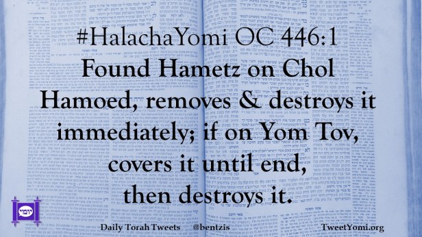 #HalachaYomi OC 446:1 Found Hametz on Chol Hamoed, removes & destroys it immediately; if on Yom Tov, covers it until end, then destroys it.