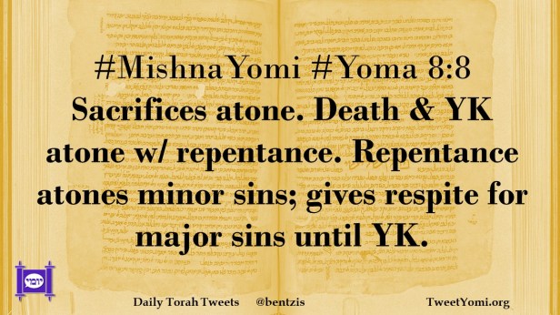 #MishnaYomi #Yoma 8:8 Sacrifices atone. Death & YK atone w/ repentance. Repentance atones minor sins; gives respite for major sins until YK.
