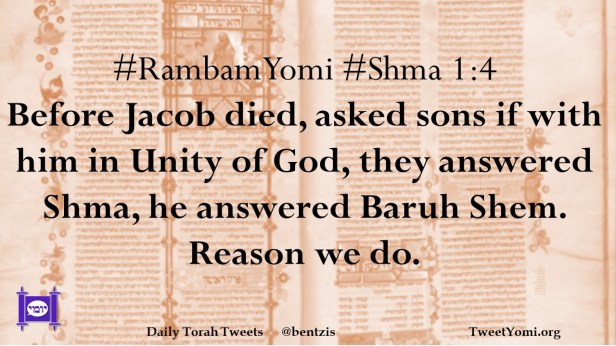 #RambamYomi #Shma 1:4 Before Jacob died, asked sons if with him in Unity of God, they answered Shma, he answered Baruh Shem. Reason we do.