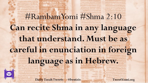 #RambamYomi #Shma 2:10 Can recite Shma in any language that understand. Must be as careful in enunciation in foreign language as in Hebrew.