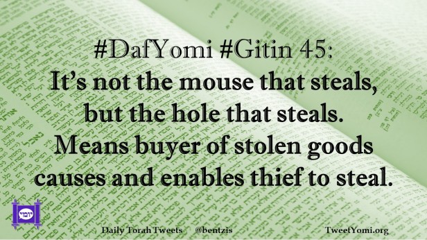 DafYomi, Gitin #DafYomi #Gitin 45 Date: July 3, 2023Author: netanelspitz #DafYomi #Gitin 45: It’s not the mouse that steals, but the hole that steals. Means buyer of stolen goods causes and enables thief to steal. Share this: Share on X (Opens in new window) X Share on Facebook (Opens in new window) Facebook Like Loading... Related