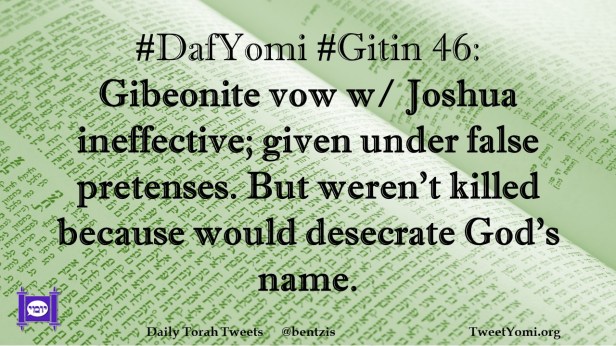 DafYomi, Gitin #DafYomi #Gitin 46 Date: July 3, 2023Author: netanelspitz #DafYomi #Gitin 46: Gibeonite vow w/ Joshua ineffective; given under false pretenses. But weren’t killed because would desecrate God’s name. Share this: Share on X (Opens in new window) X Share on Facebook (Opens in new window) Facebook Like Loading... Related