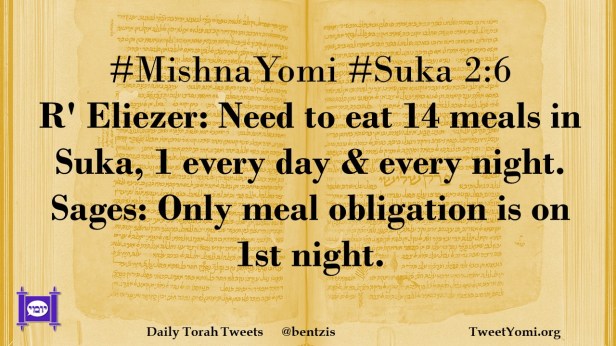 #MishnaYomi #Suka 2:6 R’ Eliezer: Need to eat 14 meals in Suka, 1 every day & every night. Sages: Only meal obligation is on 1st night.