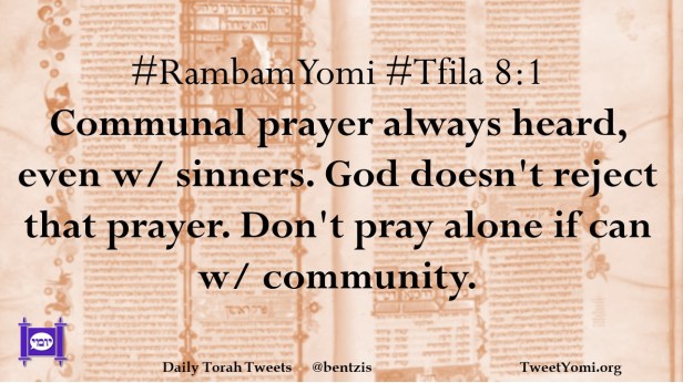 #RambamYomi #Tfila 8:1 Communal prayer always heard, even w/ sinners. God doesn’t reject that prayer. Don’t pray alone if can w/ community.