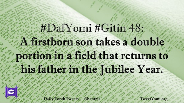 DafYomi, Gitin #DafYomi #Gitin 48 Date: July 10, 2023Author: netanelspitz #DafYomi #Gitin 48: A firstborn son takes a double portion in a field that returns to his father in the Jubilee Year. Share this: Share on X (Opens in new window) X Share on Facebook (Opens in new window) Facebook Like Loading... Related