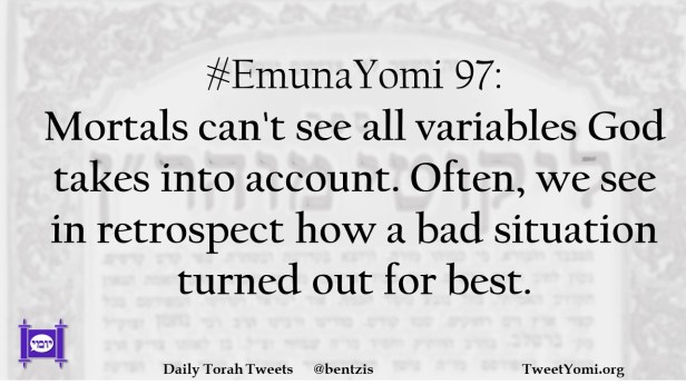 #EmunaYomi 97: Mortals can’t see all variables God takes into account. Often, we see in retrospect how a bad situation turned out for best.