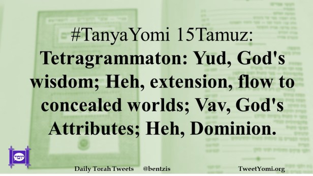 #TanyaYomi 15Tamuz: Tetragrammaton: Yud, God’s wisdom; Heh, extension, flow to concealed worlds; Vav, God’s Attributes; Heh, Dominion.