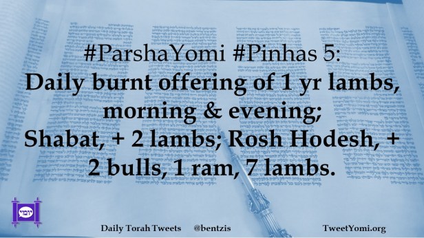#ParshaYomi #Pinhas 5: Daily burnt offering of 1 yr lambs, morning & evening; Shabat, + 2 lambs; Rosh Hodesh, + 2 bulls, 1 ram, 7 lambs.