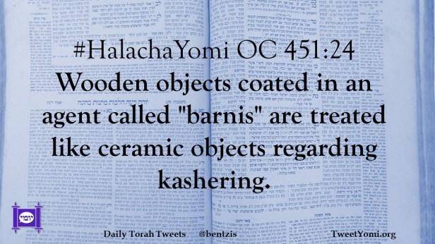 #HalachaYomi OC 451:24 Wooden objects coated in an agent called “barnis” are treated like ceramic objects regarding kashering.