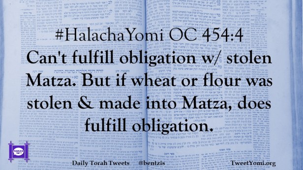 #HalachaYomi OC 454:4 Can’t fulfill obligation w/ stolen Matza. But if wheat or flour was stolen & made into Matza, does fulfill obligation.