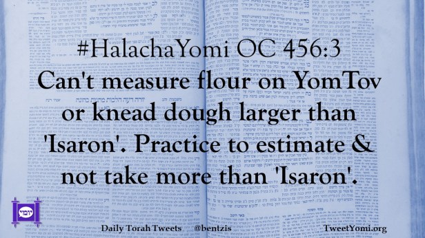 #HalachaYomi OC 456:3 Can’t measure flour on YomTov or knead dough larger than ‘Isaron’. Practice to estimate & not take more than ‘Isaron’.