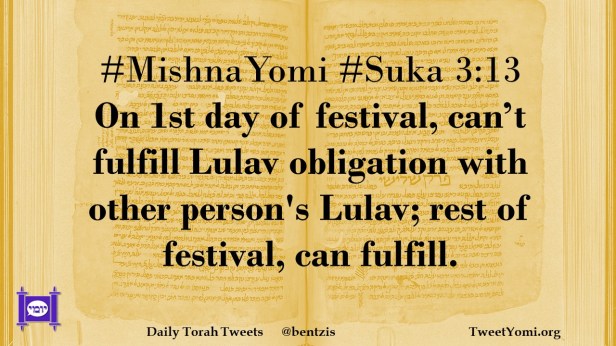 #MishnaYomi #Suka 3:13 On 1st day of festival, can’t fulfill Lulav obligation with other person’s Lulav; rest of festival, can fulfill.