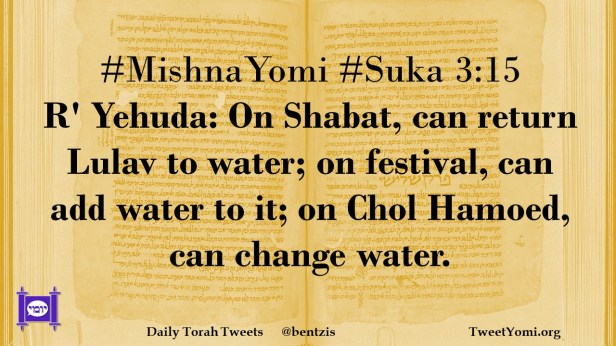#MishnaYomi #Suka 3:15 R’ Yehuda: On Shabat, can return Lulav to water; on festival, can add water to it; on Chol Hamoed, can change water.