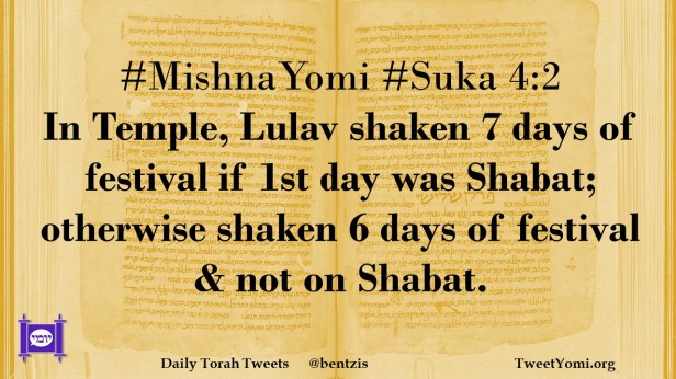 #MishnaYomi #Suka 4:2 In Temple, Lulav shaken 7 days of festival if 1st day was Shabat; otherwise shaken 6 days of festival & not on Shabat.