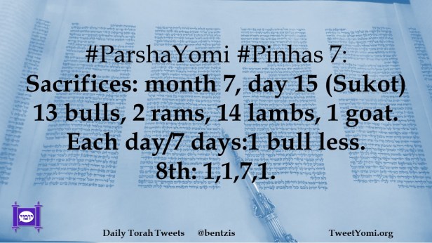 #ParshaYomi #Pinhas 7: Sacrifices: month 7, day 15 (Sukot) 13 bulls, 2 rams, 14 lambs, 1 goat. Each day/7 days:1 bull less. 8th: 1,1,7,1.