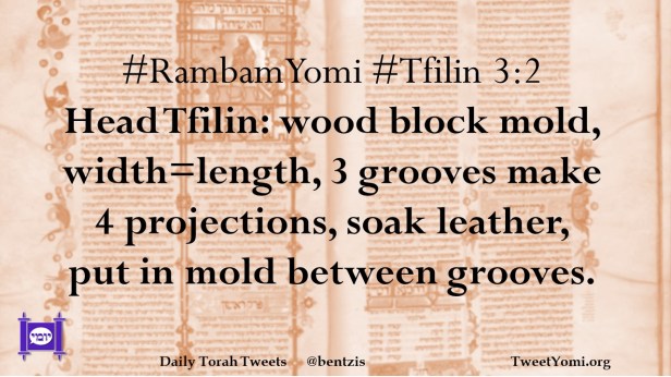 #RambamYomi #Tfilin 3:2 Head Tfilin: wood block mold, width=length, 3 grooves make 4 projections, soak leather, put in mold between grooves.