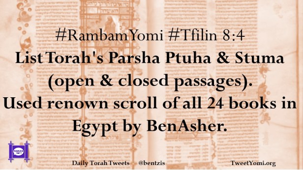 #RambamYomi #Tfilin 8:4 List Torah’s Parsha Ptuha & Stuma (open & closed passages). Used renown scroll of all 24 books in Egypt by BenAsher.