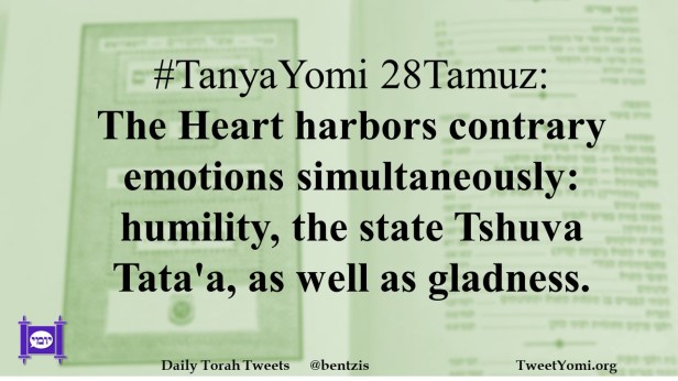 #TanyaYomi 28Tamuz: The Heart harbors contrary emotions simultaneously: humility, the state Tshuva Tata’a, as well as gladness.