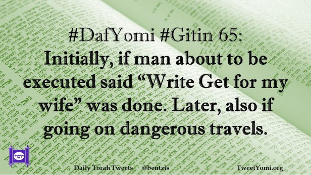 DafYomi, Gitin #DafYomi #Gitin 65 Date: July 23, 2023Author: netanelspitz #DafYomi #Gitin 65: Initially, if man about to be executed said “Write Get for my wife” was done. Later, also if going on dangerous travels. Share this: Share on X (Opens in new window) X Share on Facebook (Opens in new window) Facebook Like Loading... Related