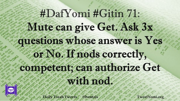 DafYomi, Gitin #DafYomi #Gitin 71 Date: August 1, 2023Author: netanelspitz #DafYomi #Gitin 71: Mute can give Get. Ask 3x questions whose answer is Yes or No. If nods correctly, competent; can authorize Get with nod. Share this: Share on X (Opens in new window) X Share on Facebook (Opens in new window) Facebook Like Loading... Related