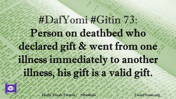 DafYomi, Gitin #DafYomi #Gitin 73 Date: August 1, 2023Author: netanelspitz #DafYomi #Gitin 73: Person on deathbed who declared gift & went from one illness immediately to another illness, his gift is a valid gift. Share this: Share on X (Opens in new window) X Share on Facebook (Opens in new window) Facebook Like Loading... Related