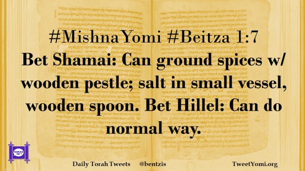 #MishnaYomi #Beitza 1:7 Bet Shamai: Can ground spices w/ wooden pestle; salt in small vessel, wooden spoon. Bet Hillel: Can do normal way.