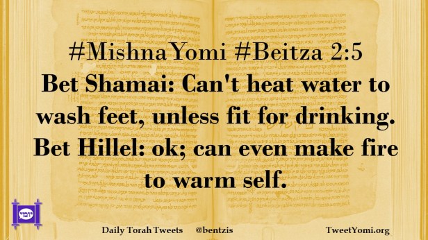 #MishnaYomi #Beitza 2:5 Bet Shamai: Can’t heat water to wash feet, unless fit for drinking. Bet Hillel: ok; can even make fire to warm self.