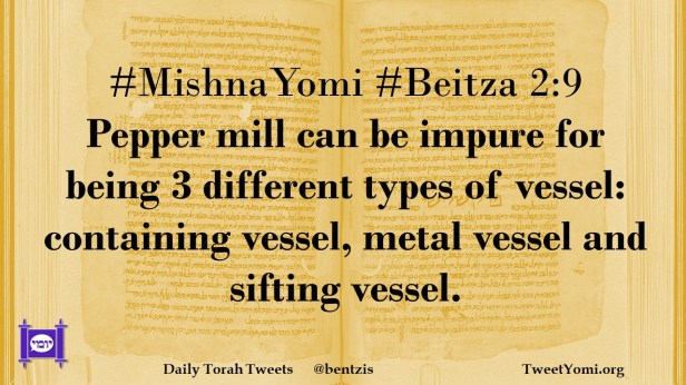 #MishnaYomi #Beitza 2:9 Pepper mill can be impure for being 3 different types of vessel: containing vessel, metal vessel and sifting vessel.