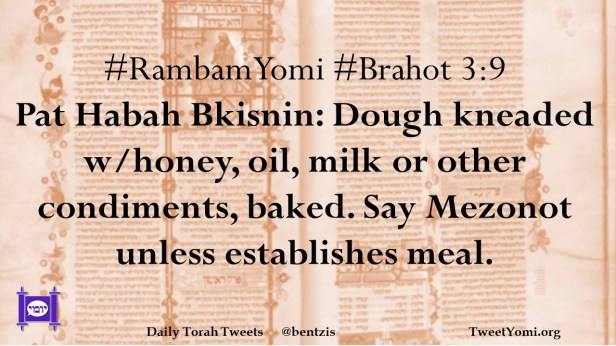 #RambamYomi #Brahot 3:9 Pat Habah Bkisnin: Dough kneaded w/honey, oil, milk or other condiments, baked. Say Mezonot unless establishes meal.