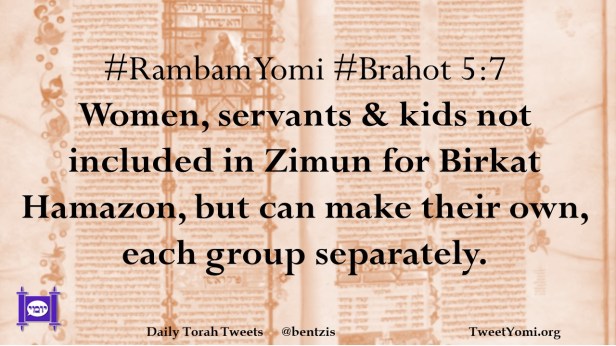 #RambamYomi #Brahot 5:7 Women, servants & kids not included in Zimun for Birkat Hamazon, but can make their own, each group separately.