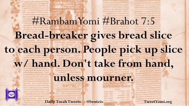 #RambamYomi #Brahot 7:5 Bread-breaker gives bread slice to each person. People pick up slice w/ hand. Don’t take from hand, unless mourner.