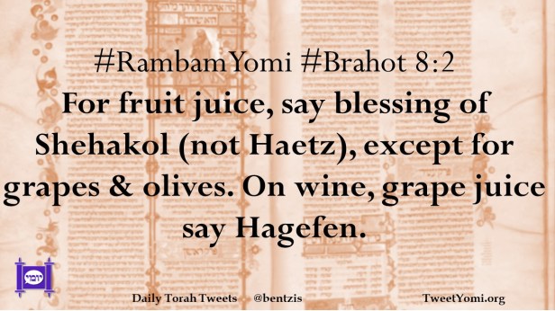 #RambamYomi #Brahot 8:2 For fruit juice, say blessing of Shehakol (not Haetz), except for grapes & olives. On wine, grape juice say Hagefen.
