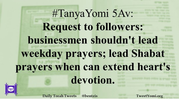 #TanyaYomi 5Av: Request to followers: businessmen shouldn’t lead weekday prayers; lead Shabat prayers when can extend heart’s devotion.