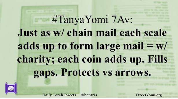 #TanyaYomi 7Av: Just as w/ chain mail each scale adds up to form large mail = w/ charity; each coin adds up. Fills gaps. Protects vs arrows.