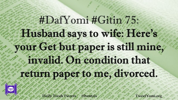 DafYomi, Gitin #DafYomi #Gitin 75 Date: August 11, 2023Author: netanelspitz #DafYomi #Gitin 75: Husband says to wife: Here’s your Get but paper is still mine, invalid. On condition that return paper to me, divorced. Share this: Share on X (Opens in new window) X Share on Facebook (Opens in new window) Facebook Like Loading... Related