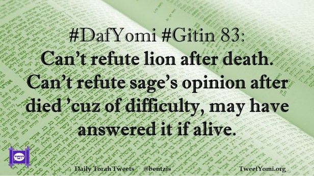 DafYomi, Gitin #DafYomi #Gitin 83 Date: August 11, 2023Author: netanelspitz DafYomi #Gitin 83: Can’t refute lion after death. Can’t refute sage’s opinion after died ‘cuz of difficulty, may have answered it if alive. Share this: Share on X (Opens in new window) X Share on Facebook (Opens in new window) Facebook Like Loading... Related