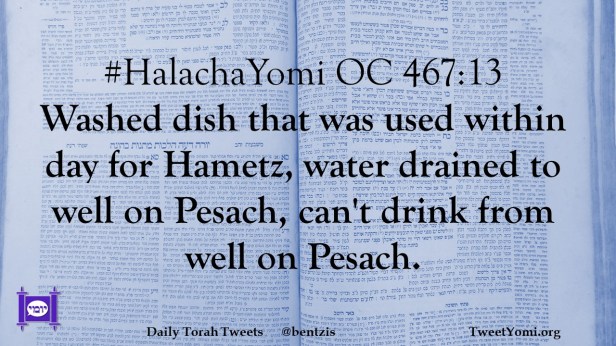 #HalachaYomi OC 467:13 Washed dish that was used within day for Hametz, water drained to well on Pesach, can’t drink from well on Pesach.
