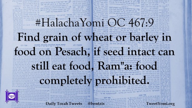 #HalachaYomi OC 467:9 Find grain of wheat or barley in food on Pesach, if seed intact can still eat food, Ram”a: food completely prohibited.