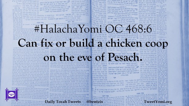 HalachaYomi #HalachaYomi OC 468:6 Date: August 11, 2023Author: netanelspitz #HalachaYomi OC 468:6 Can fix or build a chicken coop on the eve of Pesach. Share this: Share on X (Opens in new window) X Share on Facebook (Opens in new window) Facebook Like Loading... Related